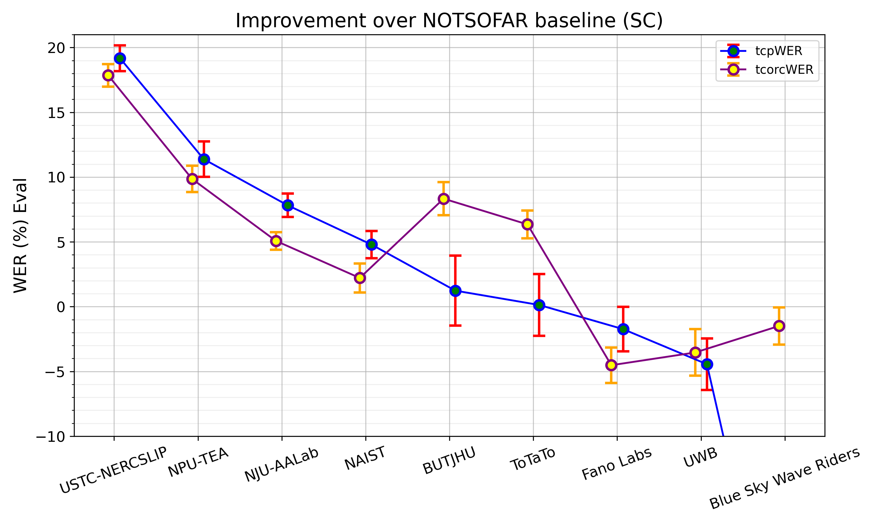 The plot below shows each team’s absolute improvement relative to the NOTSOFAR baseline (larger is better) along with confidence intervals, for both tcpWER and tcorcWER.