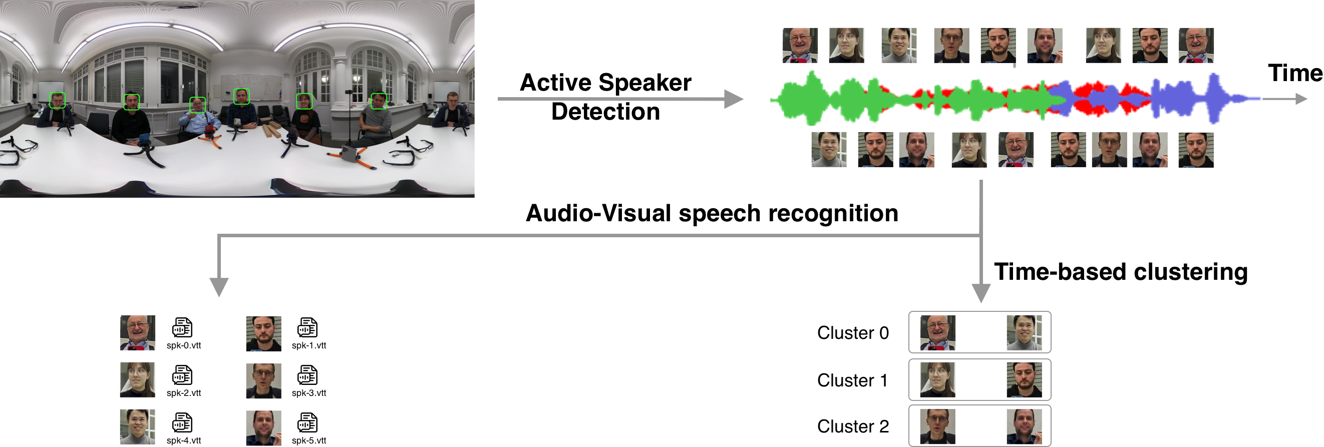 Input: Single 360° video with audio, plus bounding boxes identifying target participants Output: Per-speaker transcriptions and conversation cluster assignments